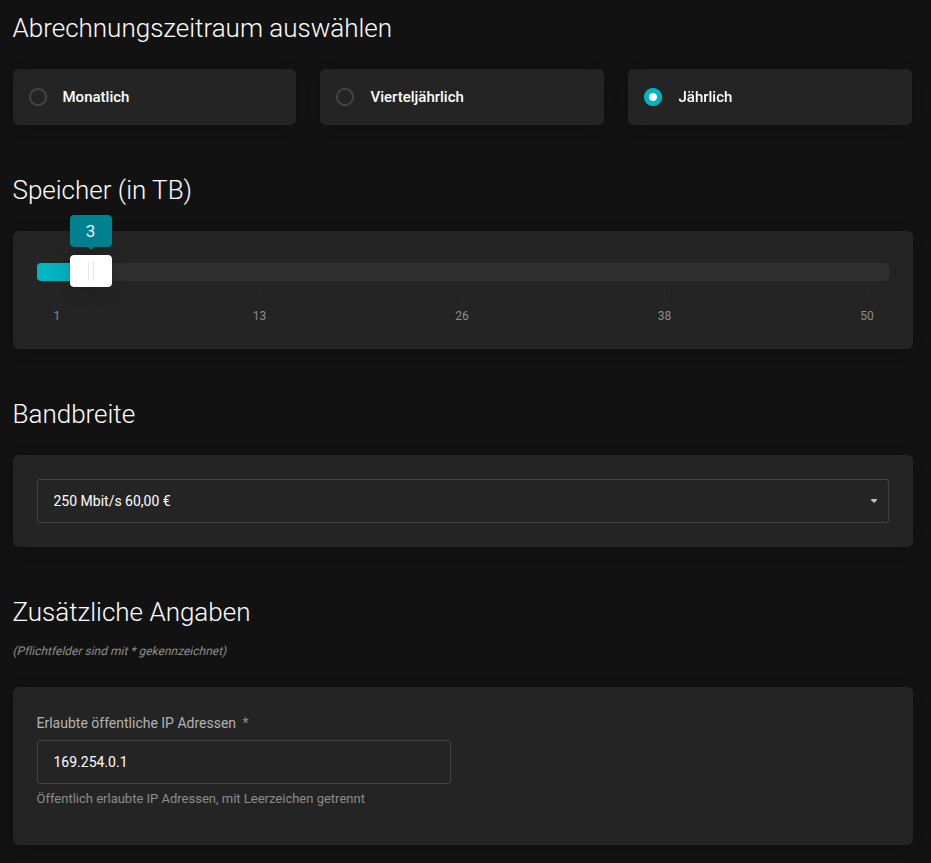 Hier können Sie den gewünschten Abrechnungszeitraum, die Größe und Bandbreite auswählen.